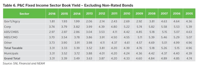 Table 3 shows earned investment income by broad asset class. Total earned income in 2016 decreased $1.3 billion from the prior year. The gross bond income declined 12 basis points (bps) to 3.14%, nearly 145 bps less than at year-end 2008, and 330 bps less than at year-end 1998 (not shown). The significance of the decline is twofold: first, the low-yield environment offers scant earnings relief to fragile underwriting results; and second, the timeline to achieve more robust embedded return continues to extend even if rising rates occur.