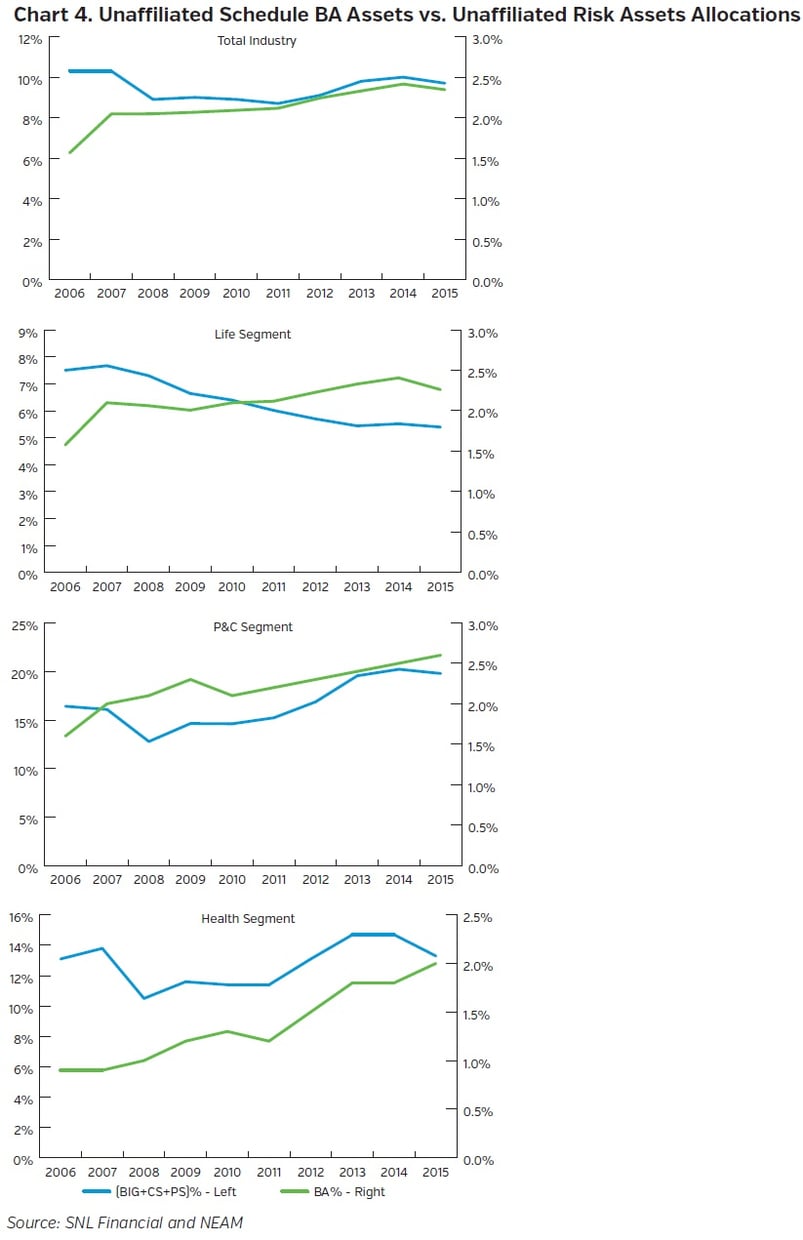 The modest upward trend of increasing unaffiliated BA investments coincides with similar movement seen in the unaffiliated risk assets allocation for the overall industry; however, the Life segment appears to offset the additional BA assets by reducing its allocation to risk assets.