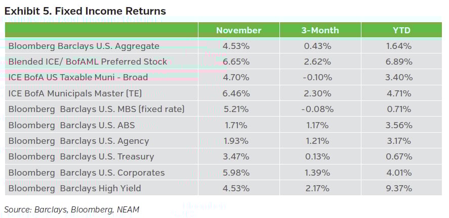 In a reverse of recent months, Treasury yields fell decently, with more pronounced changes further out the curve as economic data showed some slowing tendencies. Equity markets gained, as rates fell and expectations for further Fed rate hikes dissipated, while credit spreads ended the month tighter.