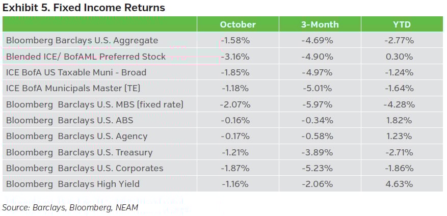 Treasury yields rose notably out the curve as economic data remained healthy. Equity markets sold off, while credit spreads ended the month slightly wider.