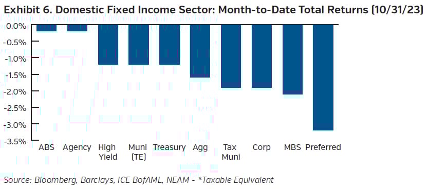 The question of how long the Fed will remain in restrictive territory, if not venture further, before easing continues to be debated. With the passing of time, the window for the lag for tighter policy to kick in shortens, leaving the Fed to determine if policy actions taken to date are sufficient to achieve their mandate. Although data has shown that the labor market is coming more into balance, and price gains in many areas are decelerating, economic data continues to hold up, as evidenced by the recent Q3 GDP print. The Fed remains attentive at the helm, ready to act, if necessary, with the surge in Treasury yields offering them some cover at the same time.