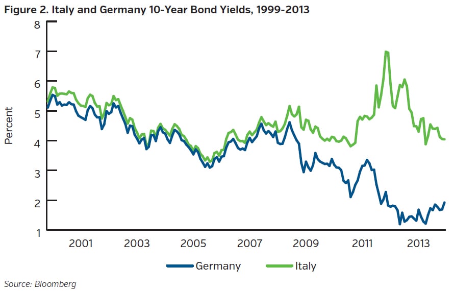 The Euro Area was designed as a monetary union but not a fiscal union. Figure 1 illustrates that countries entered the Euro Area in 1999 with vastly different levels of debt.