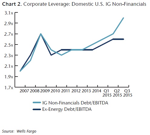 Typically, credit cycles last between seven and ten years. If we date the last credit cycle at 2008, we are approximately eight years into the current one. Today, the U.S. corporate sector appears to be moving closer to the “downturn” phase, as credit market indicators range somewhere between the “expansion” and “downturn” phases. While U.S. corporate revenues and earnings have expanded relatively consistently over the last several years, the pace of credit improvement has begun to show signs of deterioration (see chart 2 ). Record corporate issuance, with a significant portion focused on M&A has resulted in higher than average leverage in affected sectors (healthcare and telecommunications accounted for 50% of 2015 M&A activity). Additionally, the energy and metals and mining sectors have seen leverage climb, driven primarily by lower commodity prices which has resulted in a precipitous decline in operating earnings and cash flow. Weaker fundamentals have not been limited to these sectors. Leverage across the credit spectrum has moved higher (see chart 3), as many companies borrowed aggressively to pursue shareholder-friendly activities, such as stock buybacks and dividend increases. Low interest rates have enabled aggressive financial engineering by corporate issuers and this behavior has been supported, in part, by activist investors.